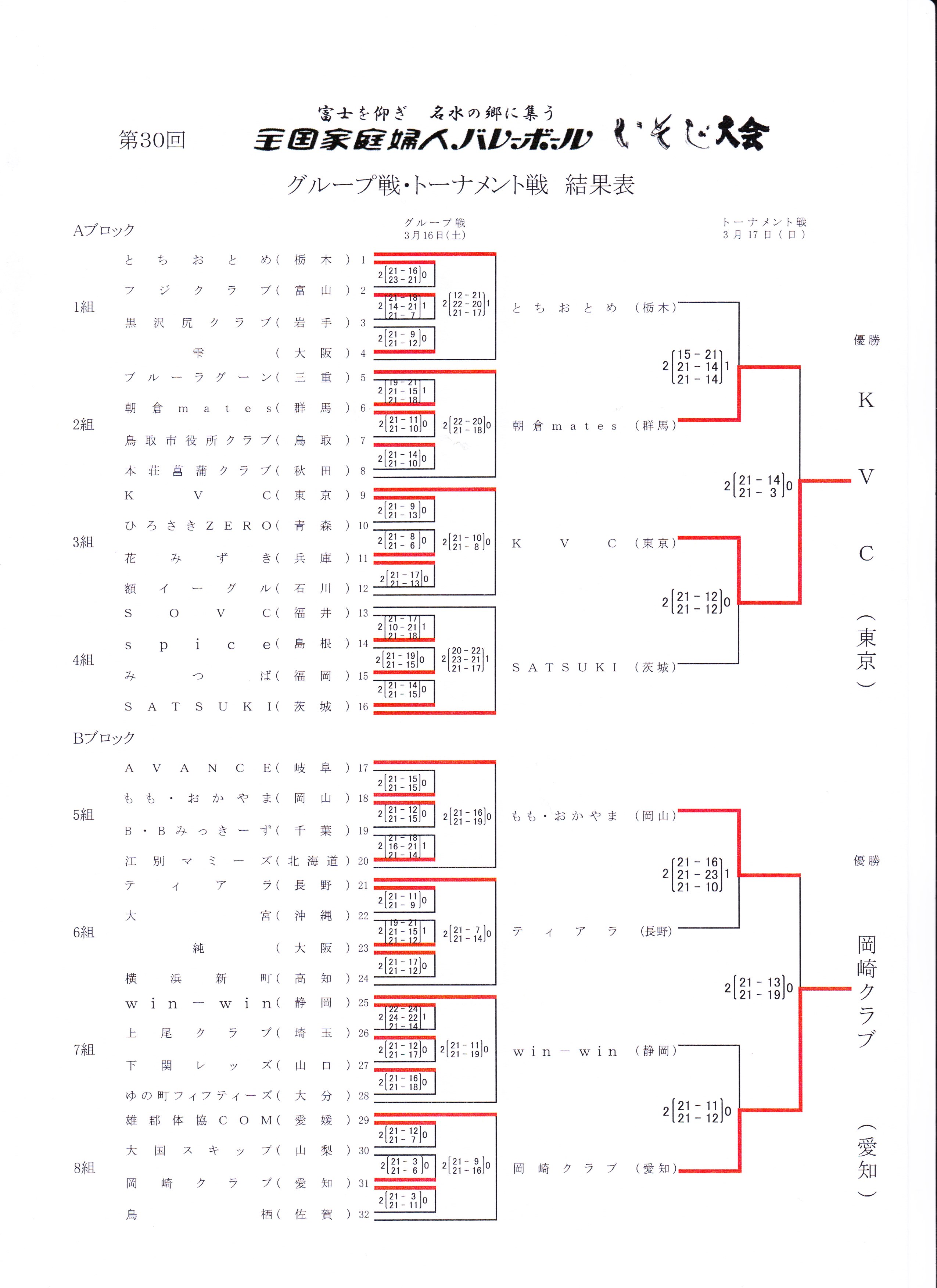 - 第30回全国家庭婦人バレーボールいそじ大会 平成31年3月15日(金)~17日(日) 山梨県甲府市
